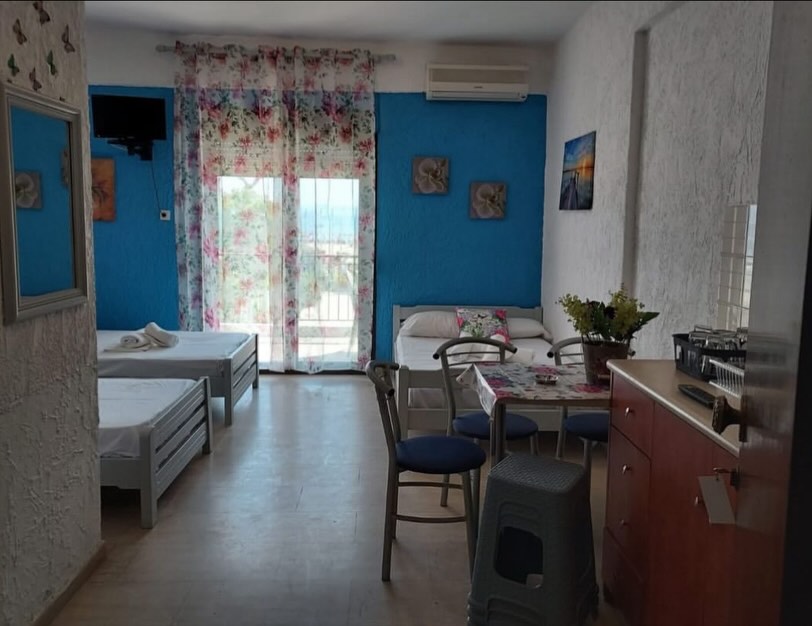 Vila Poseidon se nalazi na obali mora u letovalištu Nea Potidea, dok je ulaz u objekat na 30-tak metara od obale. U ponudi su dvokrevetni, trokrevetni i četvorokrevetni studiji koji se nalaze na drugom spratu i imaju direktan pogled na more. Svaki od njih poseduje osnovno opremljenu kuhinju, kupatilo, terasu, TV i klima uređaj čije je korišćenje uključeno u cenu najma apartmana. Tokom boravka gosti sami vode računa o higijeni apartmana, dok je promena posteljine na polovini boravka. U objektu postoji i mogućnost korišćenja WiFi interneta.